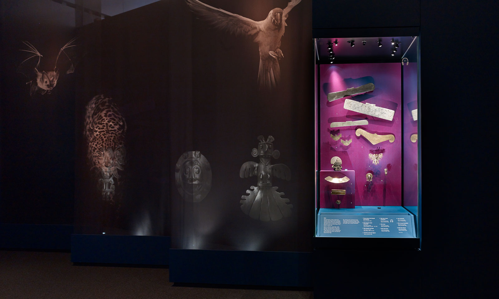 In ‘Beyond El Dorado’ at the British Museum, we used light on a slow timer to change gradually through time to tell a story. Objects included beautifully-crafted golden depictions of animals that, for the people they were made for, held mysterious powers of transformation. The objects were originally for holding powerful food substances that contributed to people having hallucinogenic experiences, believing they became animals themselves. We created showcases using shot silk, which could shift across two colours, and juxtaposed images printed onto curtains of voile with images of real animals. Over time, and almost imperceptibly slowly, the images of animals would appear or disappear, as voile appears totally transparent if lit from behind, or opaque and punchy if lit from the front. Just as in a theatre stage play, light can be choreographed to pinpoint detail and really play with our imaginations.