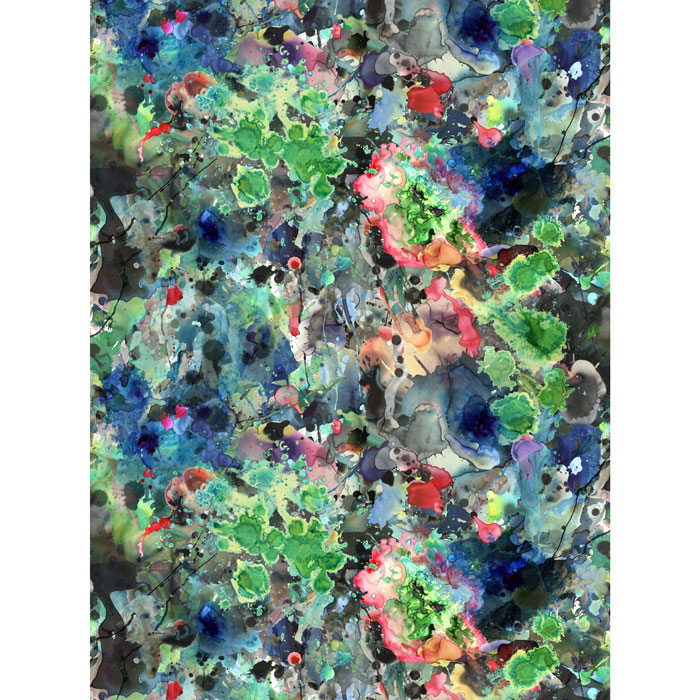 Kaleido Splatt All Over (2015) – Here, stains and blotches form a beautiful and colourful composition, reminiscent of the patterns visible when looking through a kaleidoscope. This maximalist wallpaper is not for the faint hearted as it immerses the viewer in an intense world of colourful chaos.