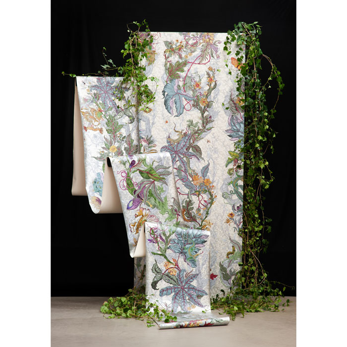 To celebrate their 35th anniversary, Timorous Beasties will present XL Jungle for Clerkenwell Design Week (20th – 22nd May 2025) at the brand’s London showroom on Britton Street. The dramatic 20m long wallpaper features a tropical inspired design that changes throughout the length. Digitally printed with an opaque white onto an embossed vinyl, the beautifully hand drawn trademark wallpaper features species of lizards, caterpillars and insects hidden amongst the intricate floral pattern.
