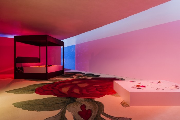 “50 wigs” also features a floral ege carpet with a stunning oversized rose motif reflecting Da Corte’s fascination of this particular flower. Adding an intimate, soft, warm and safe feeling to the room the carpet colours echo in the pinkish walls and the two sleeping arrangements.