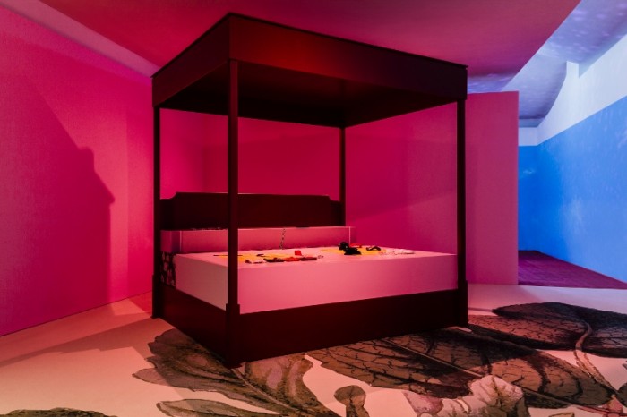 On the carpet, a rosy mattress is a reference to Warhol’s mother’s bed symbolising the close mother-son relationship. The enormous four poster bed represents Warhol’s own bed with a tin cookie jar placed on top. After Warhol’s death the jar was apparently found on top of his bed containing no less than 30,000 dollars set aside for “rainy days”.