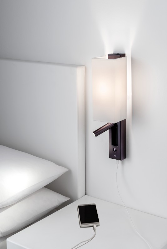 However the company’s LED Dock Combination Wall Light is perhaps the ultra in innovation. An E27 8W retrofit lamp is housed within a fabric shade along with a 1W LED reading light with a special optic focusing lens and UBS charging port.