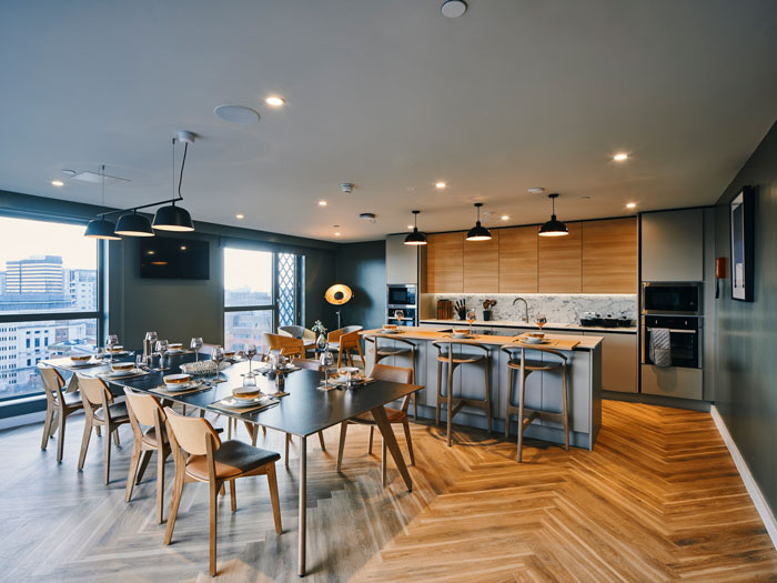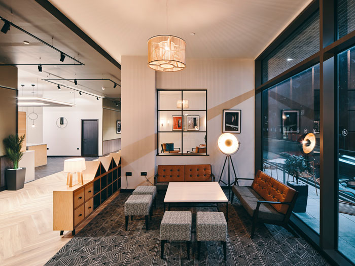 The design of the amenity spaces represents a step change away from the bright-and-cheerful approach that dominates the sector, where spaces are often saturated with primary colours. For the Manchester practice’s second scheme for London and Scottish Student Housing (following an earlier student amenity project, Crown House in Sheffield), the brief to 74 was to create a sophisticated and high-spec scheme with grown-up colours, great detailing and a pronounced hotel/hospitality influence.