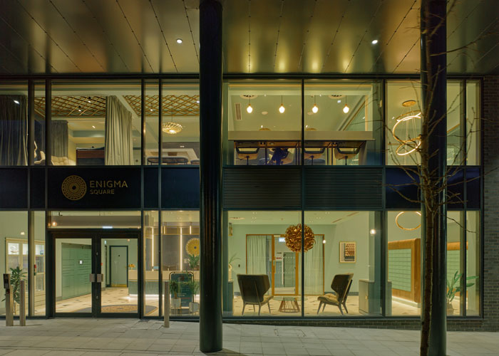 Interior design practice 74 has harmonised three different inspirational strands in its designs for the new amenity spaces at Grainger plc’s Enigma Square in Milton Keynes. Enigma Square is a new, £63m, BTR residential scheme from Grainger, the UK’s largest listed residential landlord, and encompasses 261 purpose-designed rental homes in a central Milton Keynes development on a site that once housed a YMCA. The new project follows the completion of a number of other highly-successful BTR amenity design schemes by 74 for Grainger, including The Headline and Pin Yard in Leeds.