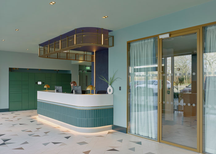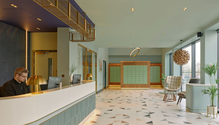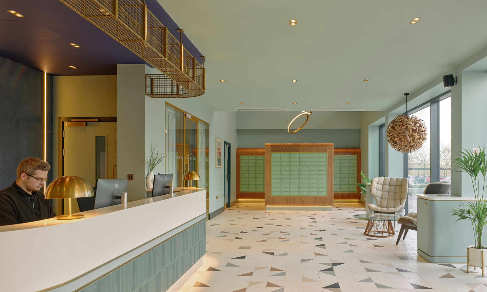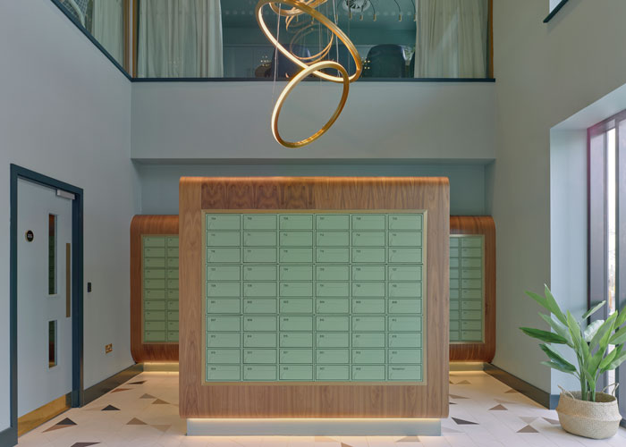When residents and guests first arrive in the scheme, they see the bespoke reception desk opposite, with the Enigma Square branding on the wall behind. The space creates an instant impression of relaxation through the use of rich tones of blue and green, but the space feels luxurious too, thanks to brass detailing, feature design elements and the scheme’s atmospheric lighting. A laser-cut circle, based on a rotor design within the Bombe de-coding machine, forms part of the scheme’s identity design by wayfinding and brand designers f.r.a. and features not only behind reception but also, in shades of blue, on the entrance matting as residents and guests first enter the space. The use of brass and brass-effect detailing throughout also links directly to the branding, including the scheme’s lighting. All feature lighting was developed together with Tyson Lighting.