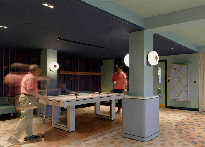 The social space, set up for board games, TV watching and pool, features a further grid system feature within the ceiling, whilst a feature blue wall treatment is decorated with a series of lines and triangles resembling leaves on stems and finished in a lacquered walnut veneer. Walnut curved armrests feature on faux leather banquettes around the pool table, whilst a bespoke light blue pool cue joinery cabinet features brass lines criss-crossing at angles. Flooring here features the triangle motif once again, this time in brown, with a highlight darker brown section delineating the pool table. A large, square table with seating all round is perfect for board games, whilst a TV area features a curtain, which can be pulled back for high-viewing occasions, such as big sports games. The sofas in this area are deliberately low-backed so that people standing can easily see the screen.