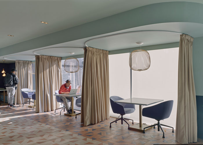 “There was a really strong focus on acoustics in the mezzanine spaces, with every possible acoustic solution available built into its ceilings, partitions and even curtains. Each zone on the mezzanine also had to be able to double up as social space, which meant thinking about multiple configurations so that the spaces could be organised for everything from casual lounge use to more organised social events or quiet working. Flexible partitioning in the form of curtains on tracks that can seal off or open spaces up also really helped with this.” 74 Senior Interior Designer Megan Jones