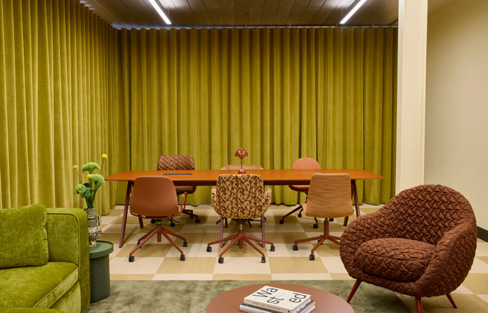 Of primary importance was the promotion of colour and the vast number of options. For example, a fabric swatch wall is a sales tool which also works to elevate colour within the space. A meeting table with different chairs upholstered in a tonal way, shows textures and is a vibrant, design-led feature used daily by the team and clients.