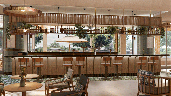 The lobby is set for a dramatic overhaul, anchored by a centrally located bar, biophilic design elements, and a curated selection of artwork that together create a vibrant yet welcoming atmosphere. Dining and social spaces are also being revitalized in collaboration with Streetsense, with standout features including an octagonal terrace bar, interactive cooking stations, and an al fresco dining concept that pays homage to the region’s rich culinary heritage.