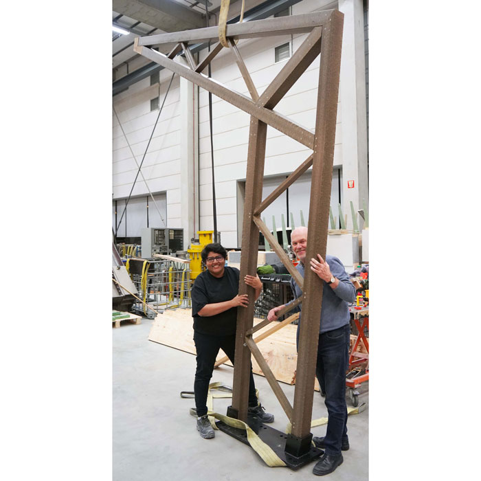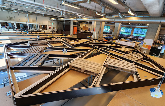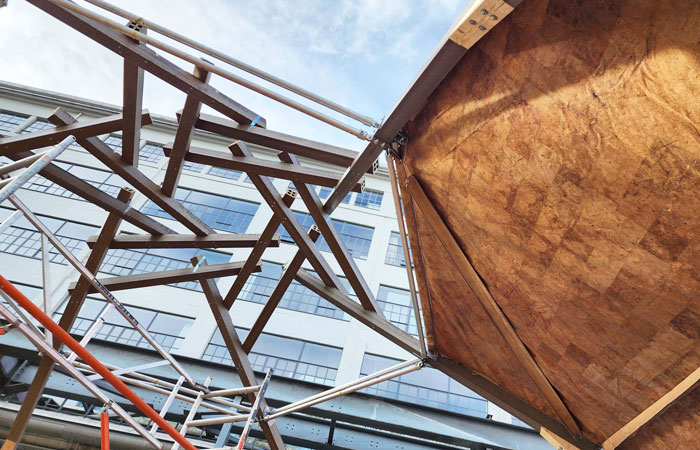 SH: Throughout my Eng. Doctorate, I developed various architectural designs based on different structural systems that focused on using the Millvision biobased composite profiles for the structure in combination with biomaterials like cork and flax fabric, which acted as a skin. These designs were structurally assessed by a separate team of two, led by Dr. Faas Moonen. Based on these assessments I further developed true-scale prototypes of the structural truss frame made from the Millvision biobased profiles along with two of my colleagues and mentors. This structural frame was first exhibited in Dutch Design Week 2022, and the final building was later exhibited at the Dutch Design Week 2023. The entire structure of the pavilion, which includes the column trusses, floor beams, and the reciprocal roof was built in the laboratory of the Department of Built Environment and proves that biomaterials can most definitely be used in construction.