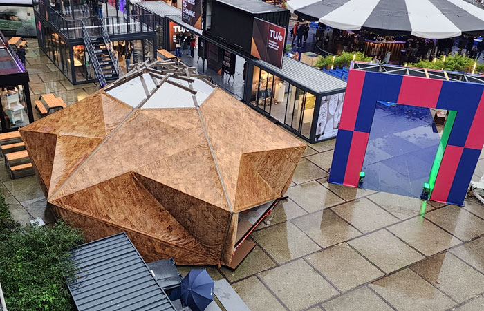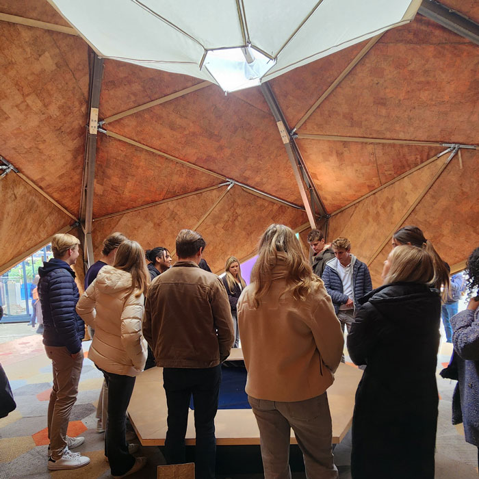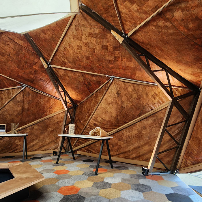 The reciprocal roof is also hexagonal in plan and rests on this assembly of column trusses. The envelope is made from cork fabric and is stitched in the shape of the volume created by the structure in six identical parts. These are draped down over the structure and connected to the structural frame with zippers for easy set-up and unfastening. The entire structure can be assembled in a day and taken apart in even lesser time. Each column weighs around 100 kilos and the reciprocal roof weighs around 300 kilos. The cork fabric is deliberately lightweight in comparison to the structure itself but is strong enough to take moderate wind and rain. Its performance was tried and tested most vigorously during Dutch Design Week back in October 2024!