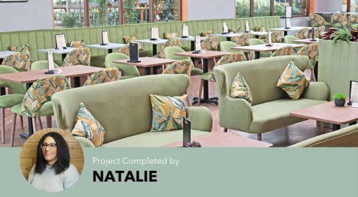 Once the models and fabrics were chosen, the Contract Furniture Group team began manufacturing and upholstering the furniture in pale greens, mustards, and leafy patterned fabrics, designed to echo the natural elements throughout the café.