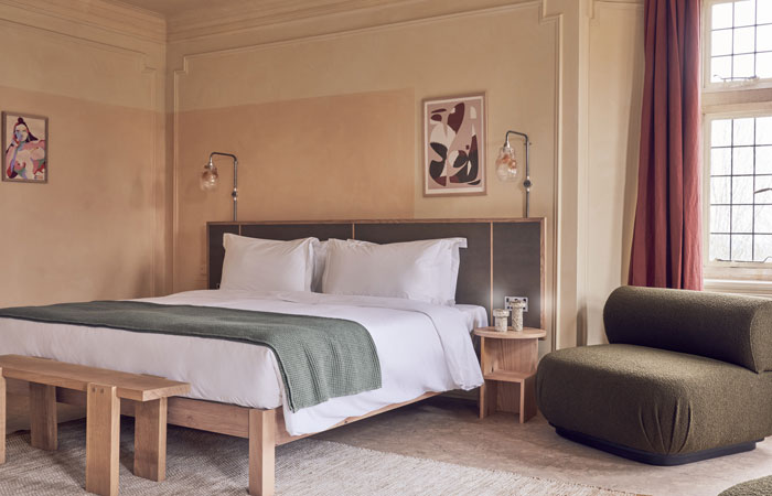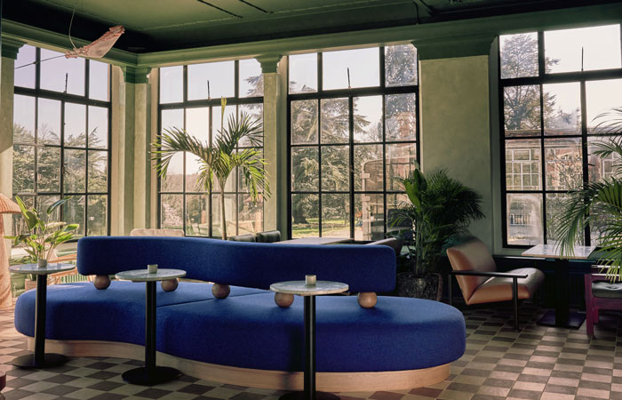 At Birch Selsdon, the bespoke furniture and lighting had an overtly sustainable and hyper local angle. Most of the timber furniture we designed such as welcome desks, the booth seating in the dining room, communal tables, and the bedside tables in each of the 210 rooms were crafted by timber felled from the rewilding of the Birch estate. Beds and wardrobes and other wooden pieces were crafted bespoke by local makers and decorative details such as the marquetry elements on the wardrobes by Chelsea Vivash were commissioned by us. The lighting in the bedrooms were also designed in collaboration with local studio Micheal Ruh. We knew we wanted to incorporate recycled glass and after visiting the studio we collaborated to create something that felt very organic and something which provided a comfortable and inviting illumination. Within the design of Birch, we also created a few bolder design pieces including a bespoke S shaped sofa in a bright Klein blue which sits in the Orangery along with a bespoke neon sculptural lighting piece which hangs in the main stairwell and was inspired by the original stained-glass window of the gothic manor.