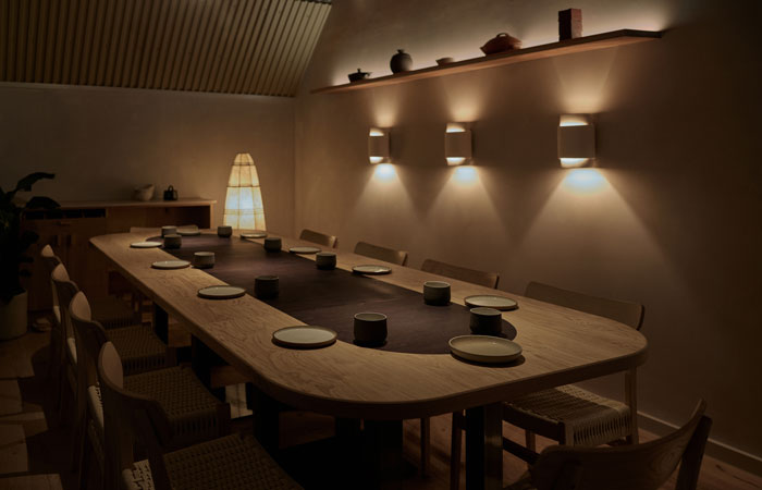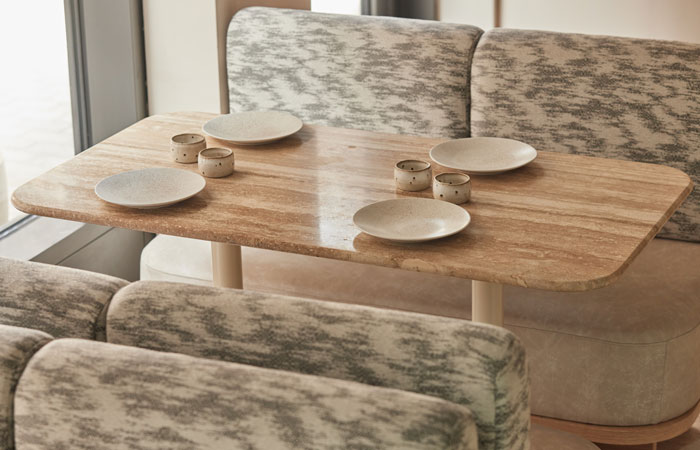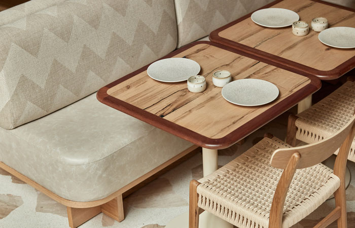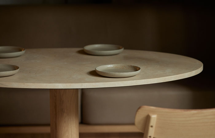 KOL’s range of furniture was all created by A-nrd studio in collaboration with artisans in Italy and the UK. The whole furniture collection focuses on subtle detailing and natural materials, a nod to the modernist aesthetic found throughout Mexico. The tables are a mix of honed silver travertine stone and oak wood which has been hand-planed to add tactility. The stone tabletops seem to be floating, with accentuated interlocking leg details. The oak wood chairs also present the same hand-planed finish and sleek leather upholstery while the window benches are more of a sculptural piece with travertine block bases and a suspended leather backing. The communal table in the private dining room was also bespoke and features two hand-planed oak planks merged by a central concrete runner to create a sectional sharing table.