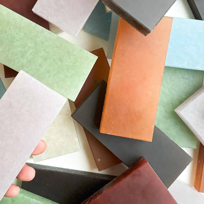 Car headlights are historically crushed along with the discarded car they are attached to, but are themselves made from a decent-sized chunk of polycarbonate. Recognising their value, Plasticiet diverts the lamps from landfill and turns them into a new solid surface, which is tinted with mineral pigments to create a silky translucent surface. Currently available in 1000x1000mm panels, the material can be joined and thermoformed, making it a hardwearing and unique option for wall panels, furniture, signage, and, rather appropriately, backlit panels.