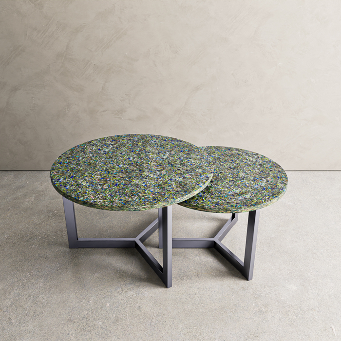 Dutch brand Plasticiet also knows a thing or two about plastic recycling. From the get-go, the studio made it its mission to transform the way people perceive plastic waste by quite literally transforming it into beautiful, functional materials. As opposed to an ever-growing issue, the team aims to show the precious value of waste. Taking singular plastic types, such as polystyrene or polycarbonate, they form robust, solid surfaces that evoke the fluidity of marble and the speckled look of quartz. A more recent product development, Karlite, focuses on a very specific waste stream, which, as the name suggests, comes from the automotive industry.