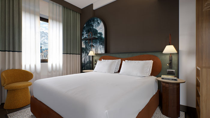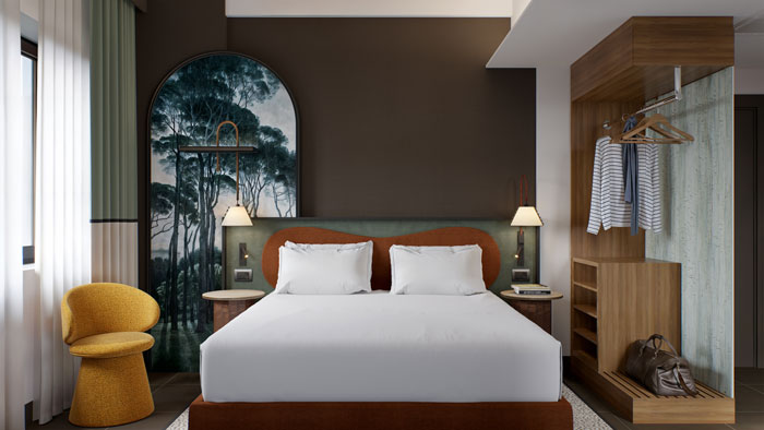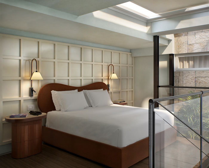 “The design takes a ‘soft refurbishment’ approach, aimed at preserving the existing architectural shell. The spaces have been reinterpreted with a warm colour palette inspired by earth and nature, creating a welcoming and refined atmosphere. The furniture combines soft lines, as seen in beds and armchairs, with the more structured geometries of open wardrobes, always in harmony with the Roman architectural elements that influence the entire project.”