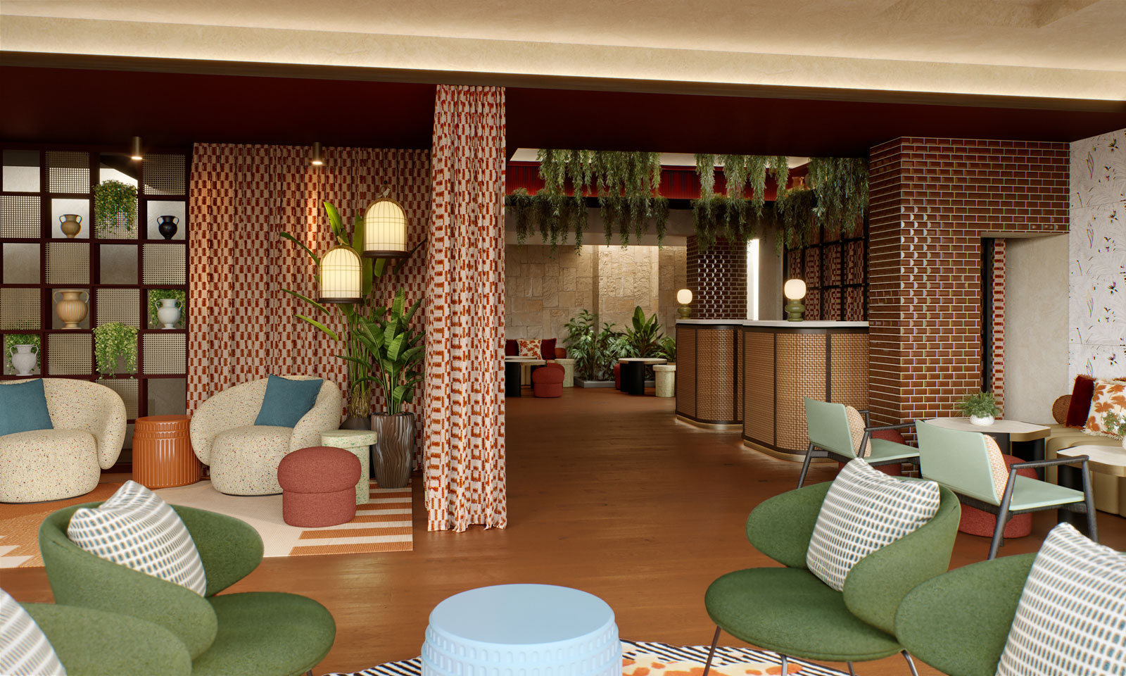 The hotel lobby is designed to be both welcoming and refined, enriched with bookshelves displaying local artifacts, surrounded by greenery to create a setting of harmony and discovery. Thoughtfully arranged seating areas foster social interaction, creating spaces for guests to meet and relax, making them feel at home. A distinctive feature is the use of ceramic wall coverings with botanical motifs, enhancing the surfaces with references to nature and decorative tradition, creating a visual interplay between interior and exterior.