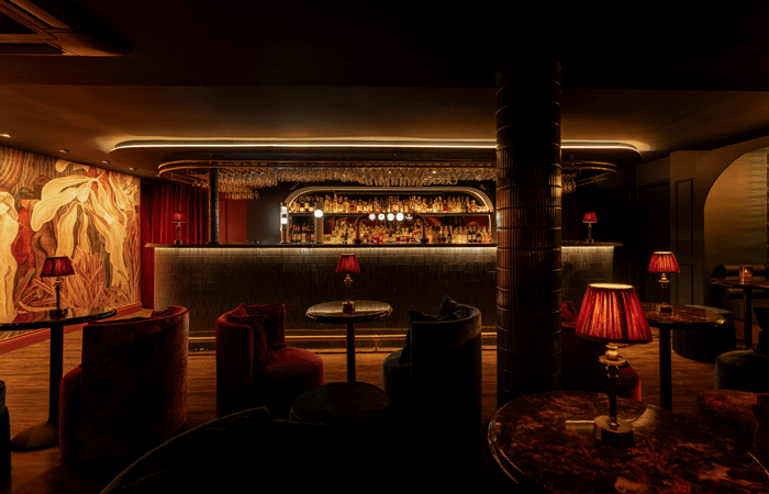 Beyond the lighting, texture plays a leading role in the design. Walls and furnishings are draped in velvet, while deep reds and navy blues create a rich, enveloping palette. Art deco-inspired patterns are woven into the space, from the upholstery to subtle details on the furniture. Chenille wallcoverings and fluted accents add depth and refinement, making every surface a tactile delight.