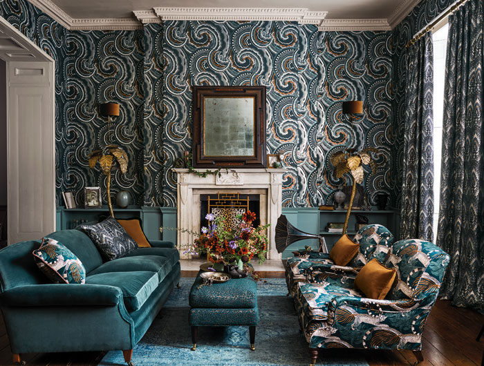 A glimpse into Alice’s wonderland, the five new collections narrate a fantastical story, taking you on a journey of magical discovery. Striking wallcoverings, indulgent velvets, fluid satins, and luxurious weaves are adorned by leaping leopards and swinging mischievous monkeys that are all part of the world of Temperley. Opulent palms, bursting blooms of colour, and swirling seas of marble, create an evocative and heady landscape, decadently embellished by extravagant, bohemian trims. The Temperley love of leopard print makes its mark, in a plethora of finishes, scales and colours, these animalistic spots work as a coordinate throughout the collections. A luxurious plain velvet in a rich colour pallette compliments the collections, providing an equilibrium to the maximalist aesthetic of the partnership.