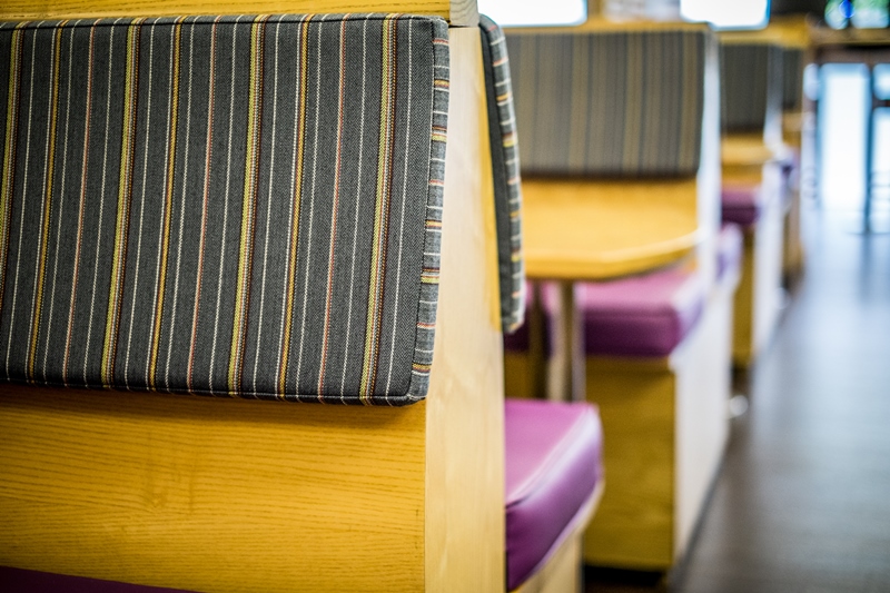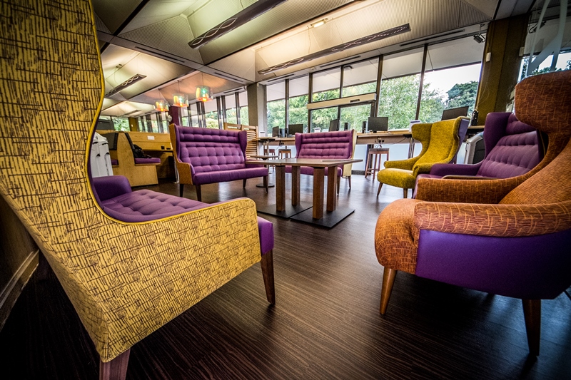 A collaboration between Abbotsford Fabrics and RMB Projects took place resulting in a colourful, vibrant mix for new Nottingham University Café and Bar.