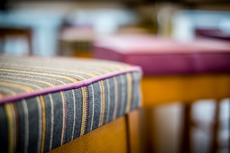 RMB Projects were asked to provide two furniture schemes for the Hallward Library Café and Vespers Bar for Nottingham University. Their brief was “to create more colour, comfort and rhythm to currently sterile, symmetrical and lack lustre environments”. RMB Projects worked closely with Vickie O’Mara, sales agent from Abbotsford, and proposed two schemes specifying several fabrics from the Abbotsford collection, specifically chosen for the vibrant colours and patterns.