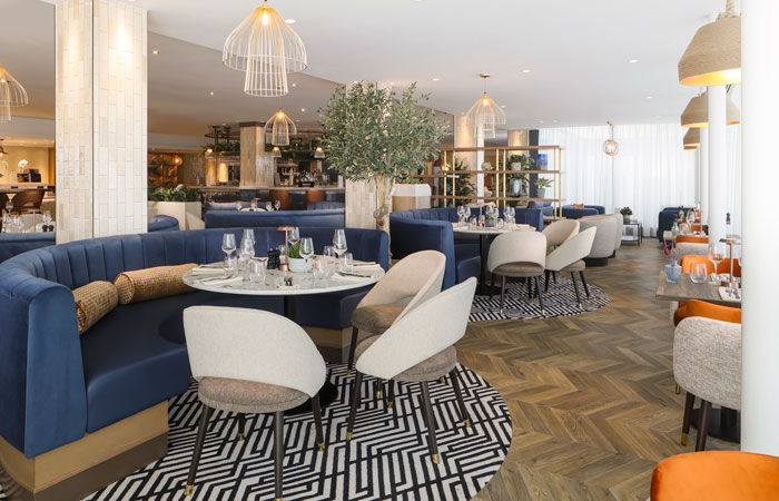 Furniture from Protocol was upholstered in a refined palette of oranges, blues, and neutrals. These colours were chosen to create a sophisticated, modern aesthetic while prioritising guest comfort. The nautical references are thoughtfully woven into the design throughout the hotel, including bespoke wall murals and tiling around the bar area.