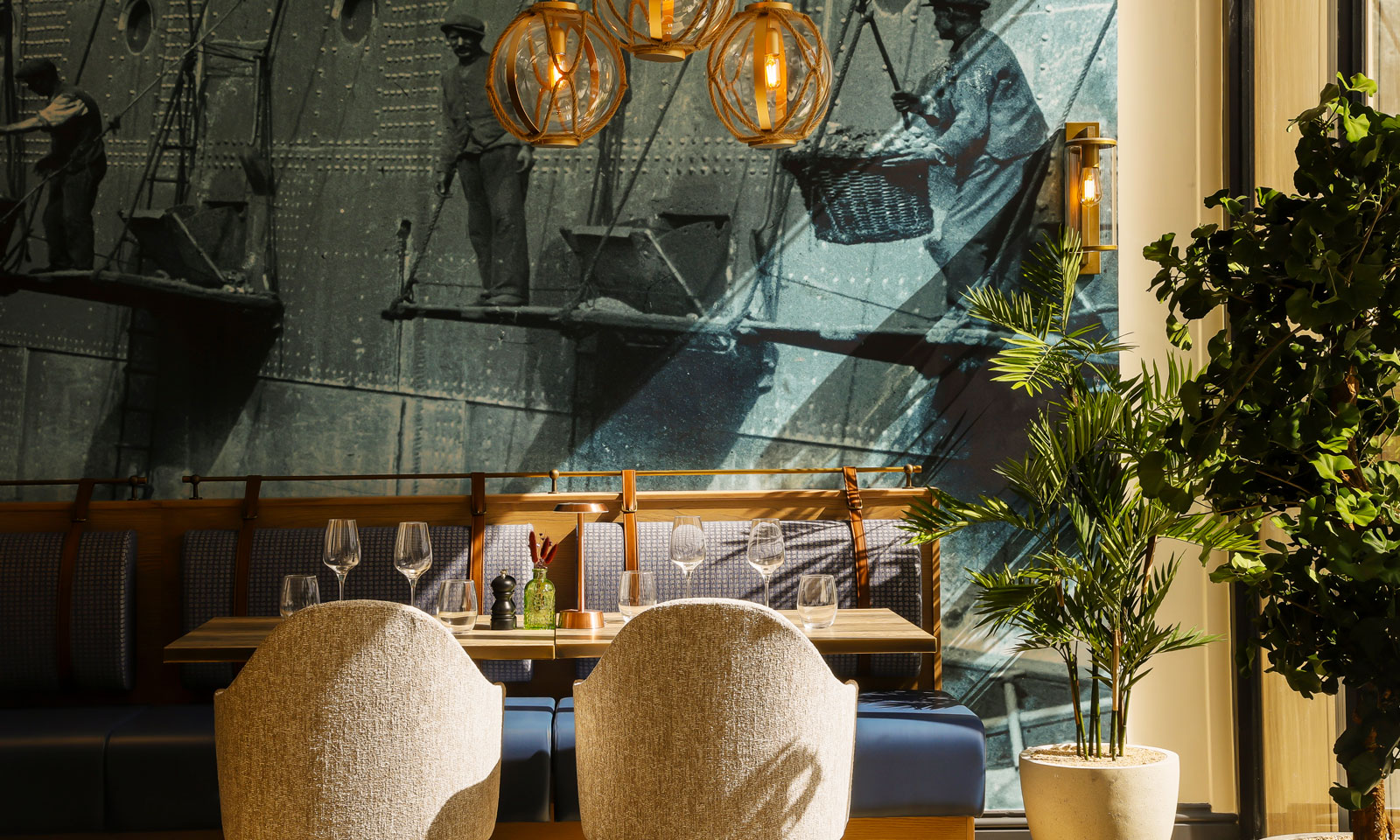 Another key design element is the feature mural, which captures an abstract interpretation of Southampton’s docks. Reflecting the bold shapes and towering presence of cruise liners, the mural adds a sense of grandeur and depth to the space. Its contemporary style provides a nod to maritime culture.