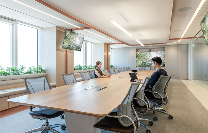 Agile meeting spaces, touchdown desks and pantries along main pathways promote interaction. They are linked by consistent linear patterns on floors and ceilings, ensuring a cohesive experience throughout.
