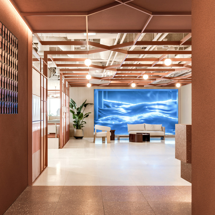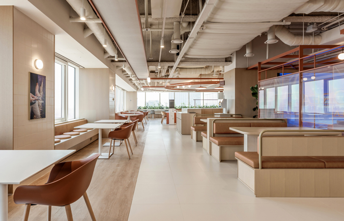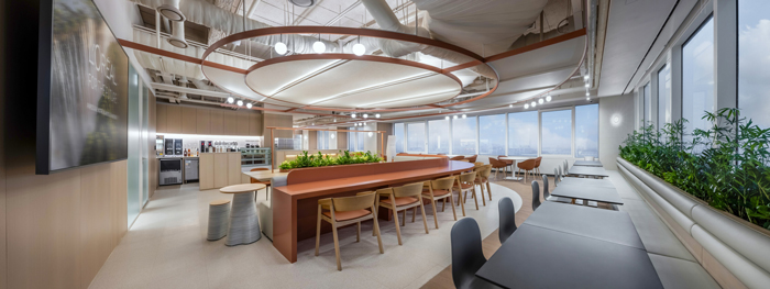It draws inspiration from Seoul’s urban layout, incorporating linear and curved lines reminiscent of the city’s intersections and grid patterns alongside Gangnam’s towering skyscrapers. These features connect the workplace’s main areas while celebrating local elements, such as the traditional Hanok window patterns and Jo Kak Bo fabric, for a space that speaks Korean heritage.