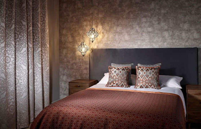 Designed to work well with Skopos accents and upholstery fabrics the collection also comes with the added benefit of an antimicrobial treatment, ticking the box in the fight for best practise hygiene standards within hotels and all other contract interiors going forward. The Silk Roads meets the requirements for FR standards set for contract fabrics and achieves IMO bedding and drape*, for marine interiors.