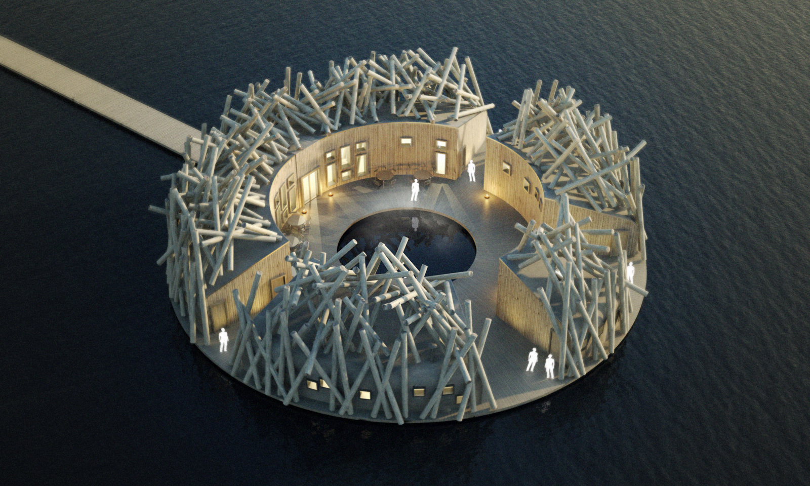 Arctic Bath has a circular shape which creates a protected environment. The center of the bath is great for both sunbathing and winter bathing, a cold bath under the sky. The main floating building has a cold bath, hot bath, several saunas, spa treatment room, lounge, shop, bar and a restaurant. The total area is approximately 500 square meter and the 6 separate floating hotel rooms are approximately 25 square meter each.