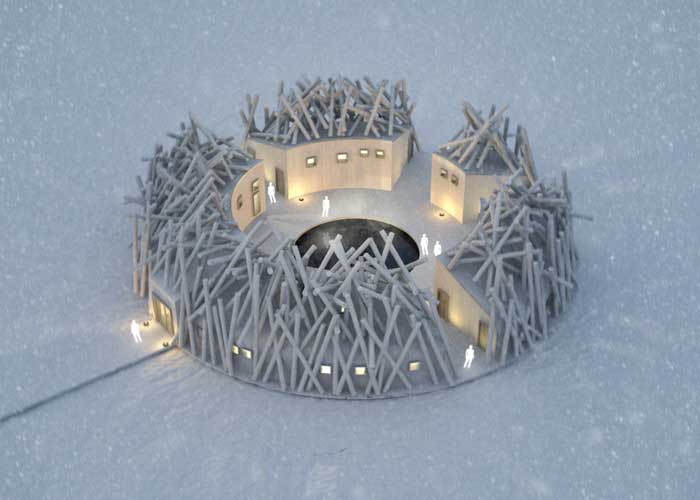 The building is inspired by the timber floating era and becomes a monument, a reminder about the importance of forests for the entire country’s development. The main building is inspired by a jam of floating timber in the river. The overriding concept for the project is to exploit contrasts, hot and cold, water and wood, history and future.