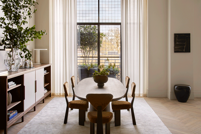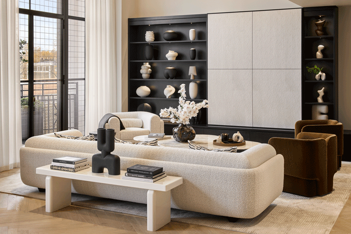 Black is used with confidence throughout the scheme, particularly within the joinery, to give the apartment structure and definition. One of the clearest examples is a custom shelving unit in black bird’s eye maple, created with Irish craftsman Killian Johnston, which conceals the television behind a hidden panel.