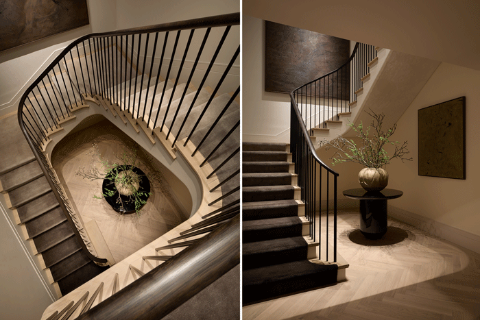 The staircase was treated as a design moment in its own right. Maoliosa introduced a hand-knotted wool and silk runner which continues onto the landing in an ombre transition into a deep chocolate-toned carpet, helping connect the duplex vertically.