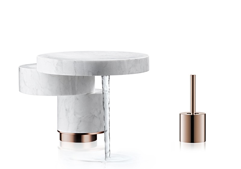 In British architect David Adjaye’s concept Ritual, water appears from under a granite inlay that is cradled by a wedge-shaped, precious metal (bronze) spout. The water, always in view, is ritualized: from source, to flow, and finally, to descent.