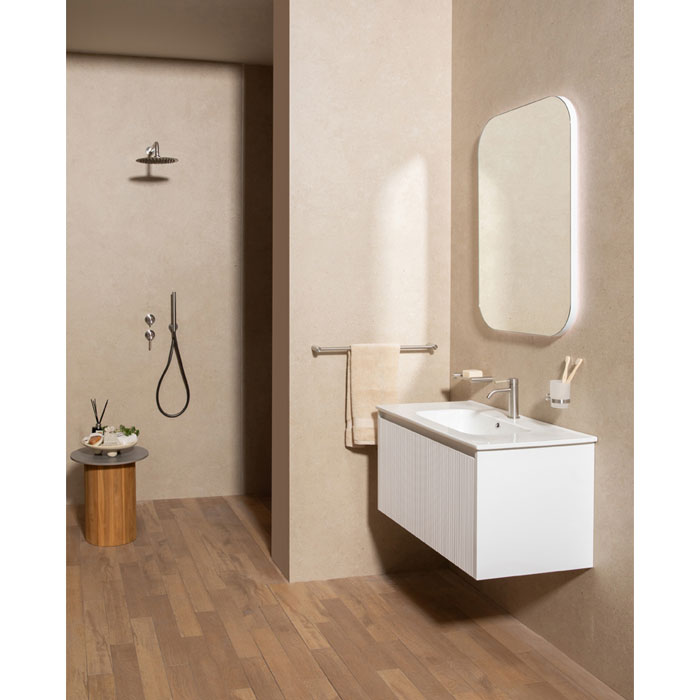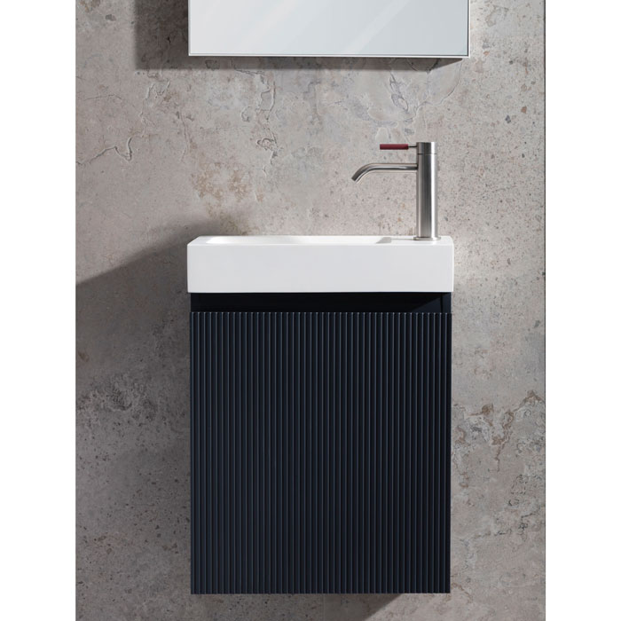 Stunning in its simplicity, the versatile Studio 316 range also includes vanity units with elegant, slimline ceramic basins that integrate seamlessly with the furniture. Featuring the same fluted finish as the mixers, the vanity units are available in Matt Navy, Matt White, Oak Wood and Soft Grey to provide a cohesive design and enhance the modern aesthetic. They come in four versatile sizes of 450mm, 500mm, 600mm and 800mm.