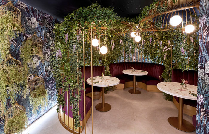 Towards the rear of the café, striking oversized birdcages create a centre piece amongst the forest canopy. The metallic marble tables from Versital complement this feature area perfectly, providing the perfect photo opportunity for visitors.