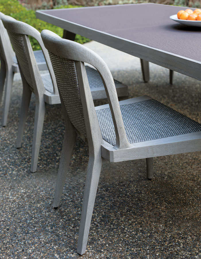 Expertly crafted in teak with a Driftwood finish, the impressive dining, café, and side tables are topped with an intriguing textured Alabama ceramic. The collection’s sculptural modular and lounge pieces pair durable teak frames with beautifully woven JANUSfiber in Smoke, creating a rich display of deep gray hues stippled with light and dark tones. Ample cushions for the seating elements provide a luxurious, comfortable sit. Rock Garden’s masterful balance of light, proportion and clarity creates a profound impression whether situated in an urban apartment, rustic outdoor patio, or a luxurious seaside resort.