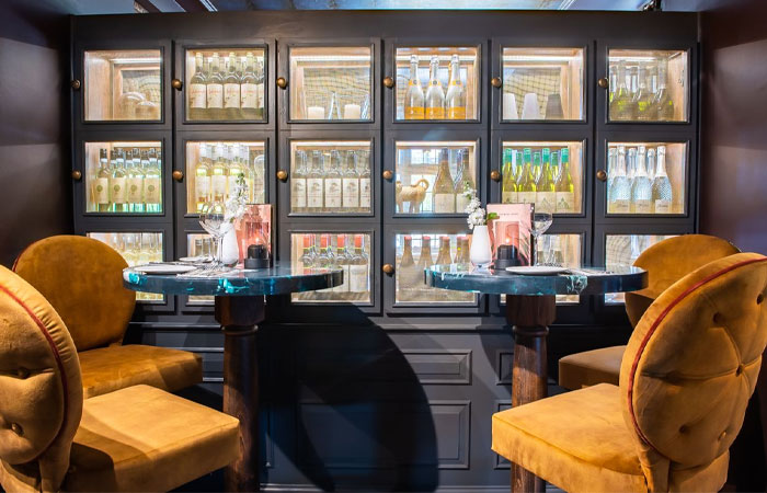 Separate dining areas for private parties are also available. The design is brought together by the soft textures of the upholstery, as well as contrasting metal and tiled elements.