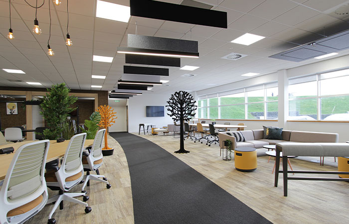 Using ceiling panels and baffles from Tektura’s range of Zintra acoustic solutions, internal and external sound influences are absorbed reducing the noise level in the open-plan office space. Two acoustic products were selected: the baffles and the ‘door’ hanging from the ceiling are all Zintra. The hanging door suspended from the ceiling was even custom made, as they ‘etched’ the door effect into a flat panel. Can be cleaned with diluted bleach. More information on Zintra acoustic solutions can be found HERE.