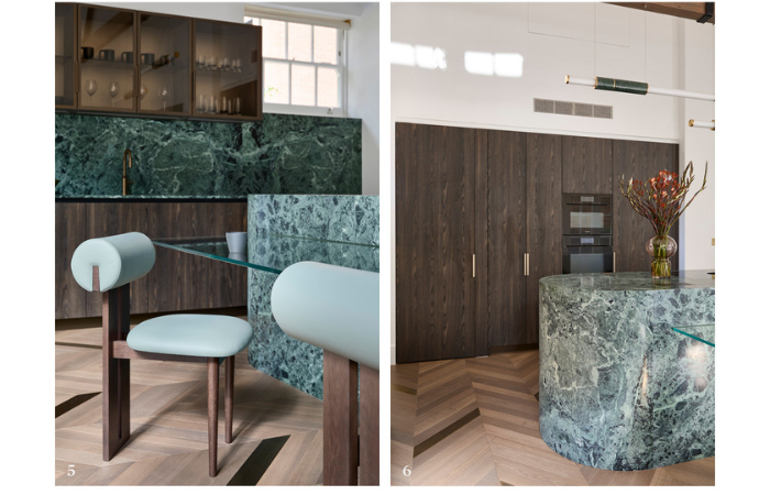 In the Chelsea Kitchen project, featured on the cover of the latest Havwoods WoodBook, bespoke detailing takes centre stage. This one-of-a-kind kitchen seamlessly balances contemporary style with the historic character of the building, brought to life through luxurious materials and tailored engineering solutions. Designed by Jess Palmer of Golden Mean Design in collaboration with Poggenpohl, the scheme combines vertically book-matched smoked ash cabinetry and deep Verde St Denis green quartz marble with Havwoods’ Lava chevron flooring, accented by brass inlays inspired by Art Deco design. The result is a refined yet distinctive interior that celebrates craftsmanship and modern luxury.