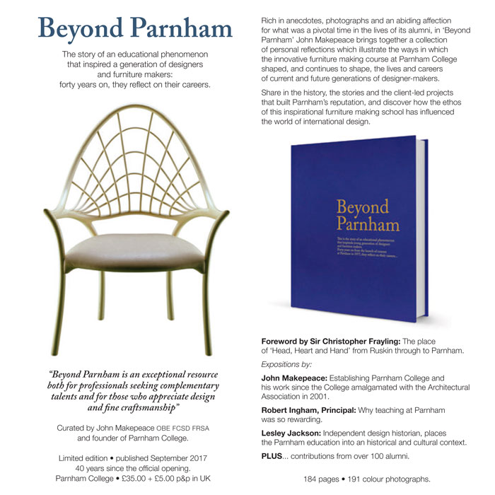 Celebrating the milestone anniversary, John Makepeace, winner of the 2016 Prince Philip Designers Prize, this September releases ‘Beyond Parnham’– an exclusive 180-page book detailing Parnham College’s innovative vision and cultural legacy, revealing highly personal reflections from the designer-makers and esteemed tutors who trained them.