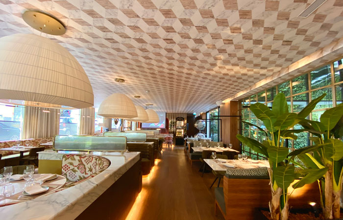 In Porto, Portugal, the Dorte Restaurant designed by Sofia Carneiro and Alexandre Ribeiro demonstrates how using Newmor’s standard Marble Geometric design on the ceiling visually expanded the space. Printed on Newmor’s Graphite base, the mixed-material look of marble and woodblock elevates the restaurant’s interior while adding depth and sophistication.