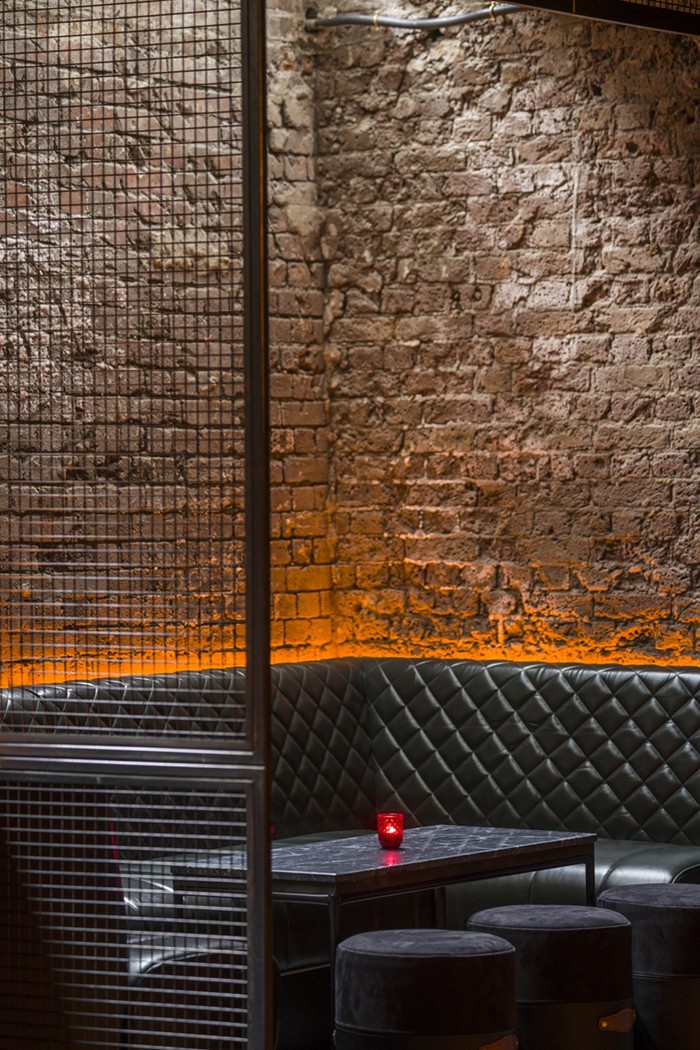 Downstairs, lighting strips overhead synced to the music create a dynamic interrelationship between the space and the design. Leather seating is encased around steel mesh screens adding an industrial feel. Darker, with rough textured walls and a second stage, it’s a place to party.