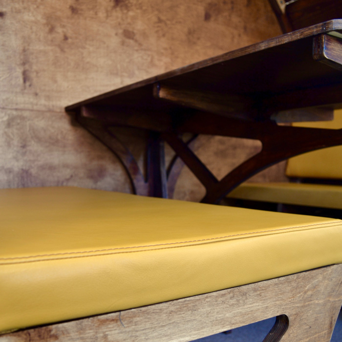 The flagship product is intended to look as natural as possible using lightly-sanded, sawn planks treated with hard wax oil. Plywood has exposed edges to display the plys. Fixings are visible. The fabric is leather with a top-stitch to ‘show’ the stitching. All the effects add up to a biophilic product that has a natural feel.
