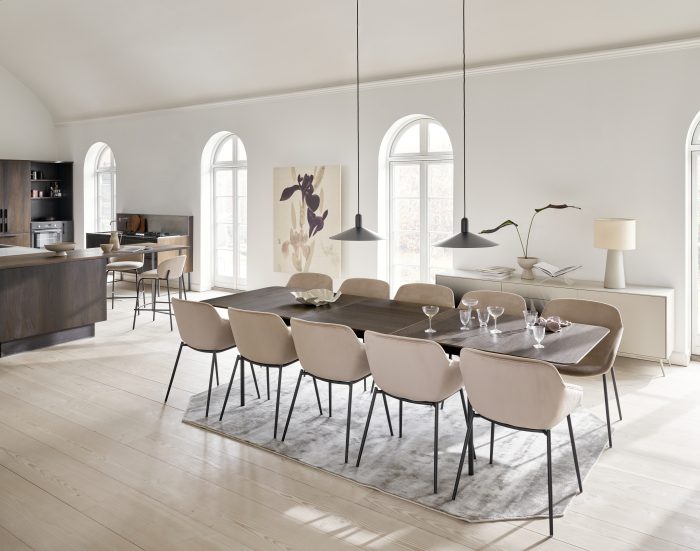 With the Vienna chair, the label presents a comforting bucket seat, offered in a range of finishes from textured weaves to velvet and fine leathers, with or without a swivel base so you can continue the style from your dining room through to your home office.