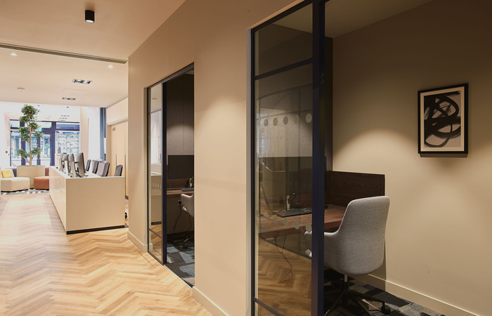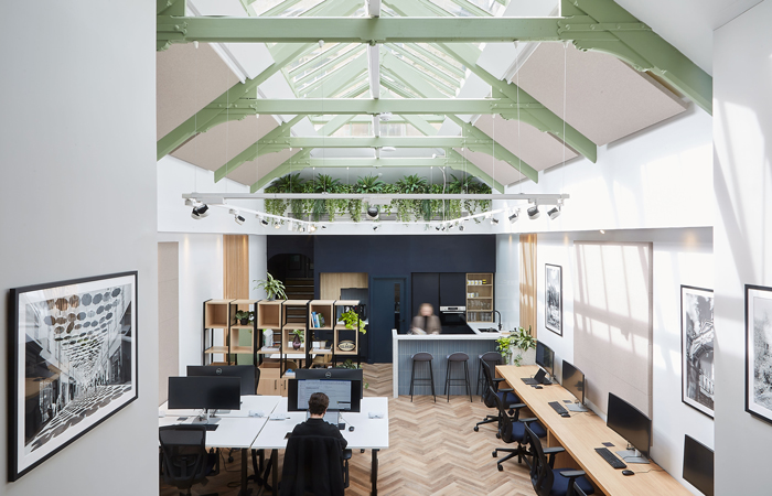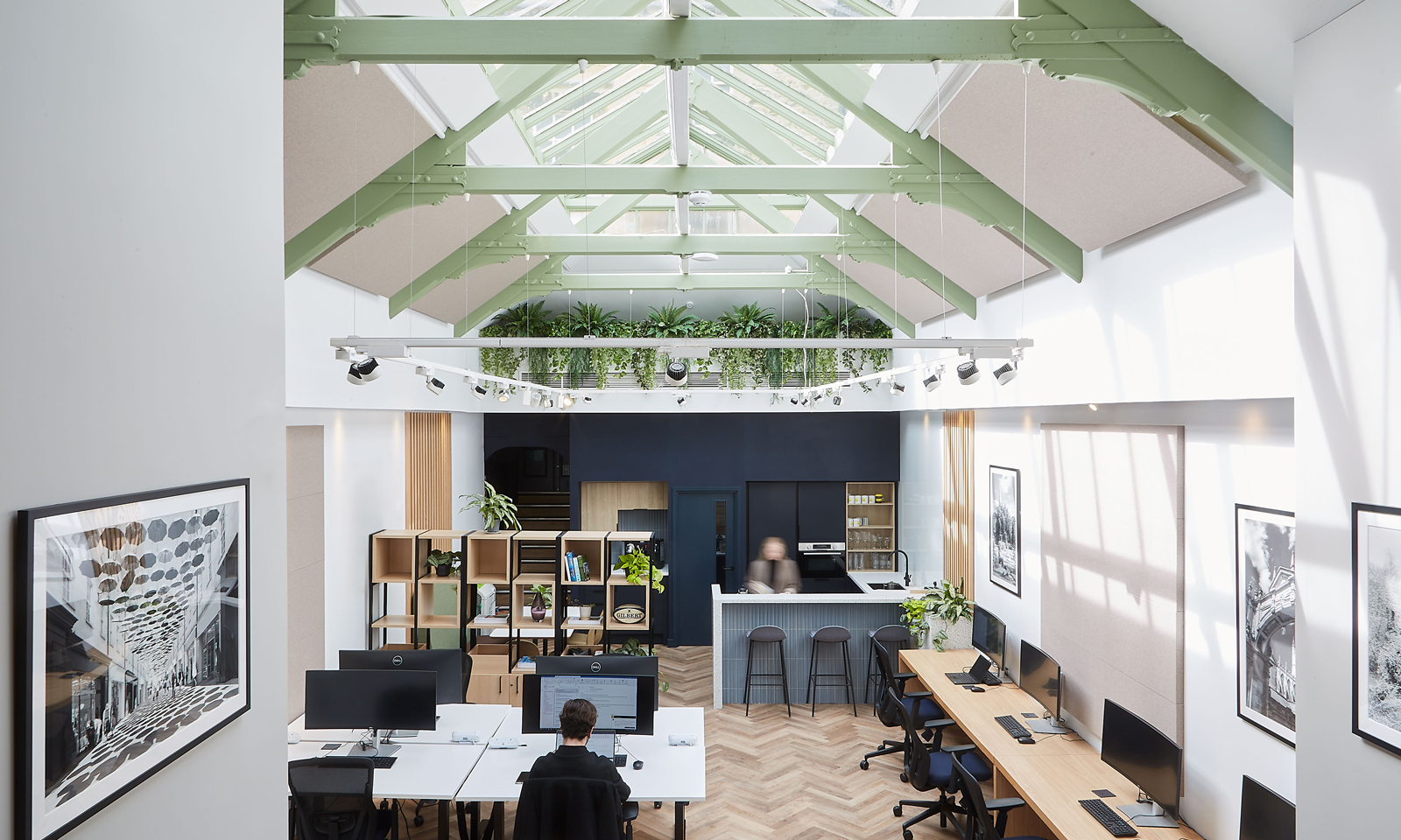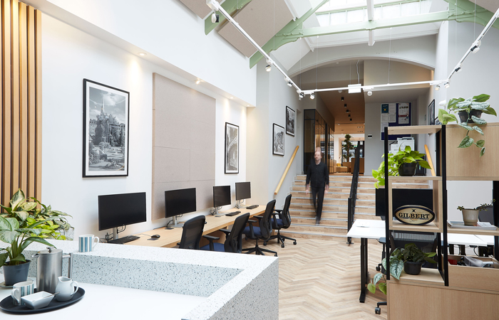 Featuring distinctive architectural window displays that pay homage to Bath’s heritage, the design draws visitors into the space and guides them through the entrance where they encounter unobstructed views, extending all the way to the double-height space at the rear of the office. The resulting sense of openness and transparency reflects the company’s commitment to people, transparency, and collaboration.