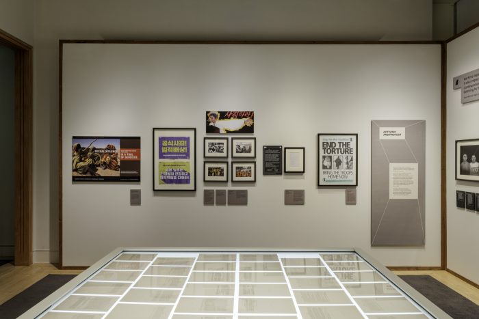 Finding 3D objects directly linked to the exhibition’s themes was not an easy task – forming part of the silence that has historically surrounded this subject – and so the exhibition features a mix of written and oral testimony, historic posters, photography, totemic objects and works of art. These include a painting by South African artist Albert Adams, photographs by Lee Miller and a miniature Sonyeosang (Statue of Peace) copied from a 2011 bronze by husband-and-wife sculptors Kim Seo-kyung and Kim Eun-sung.