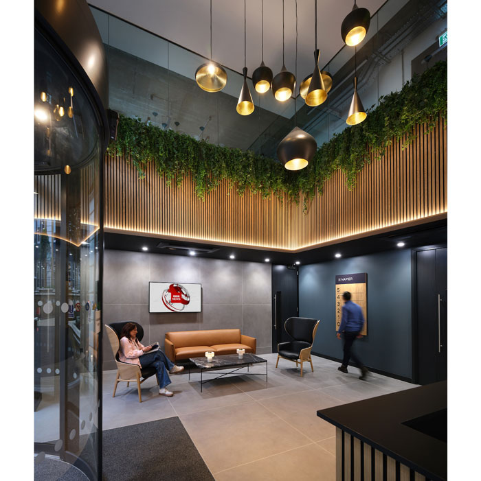 Preserving existing structures and avoiding demolition were major priorities from the outset, reflecting Schroders’ strong commitment to sustainability and ESG principles. This approach not only minimised waste but also underscored the project’s dedication to eco-conscious practices. GTA Interior sourced sustainable materials and energy efficient technology to achieve certifications FitWel, WELL, NABERS, ActiveScore, Air Rated, and WiredScore. Napier House is on track to achieve BREEAM Excellent, while the remaining buildings has already earned BREEAM Very Good.
